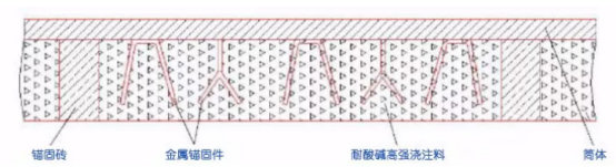 采用上述浇注料在回转窑筒体的内表面上浇注厚度不低于250mm。内衬包括多块呈轴向均匀分布固定于筒体内表面的酸性或中性锚固砖,锚固砖两侧的筒体内表面固定有多个均匀分布的金属锚固件,再用耐酸碱高温浇注料,该耐酸高强浇注料通过锚固砖和金属锚固件与筒体连接为一体。局部内衬结构如图1所示。
