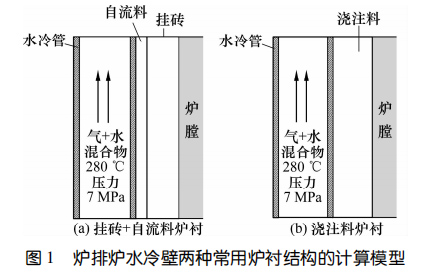 国内外炉排炉在水冷壁内衬结构设计上有较大差别,国外炉排炉水冷壁内衬结构为鳍片(扁钢)挂钉 sic挂砖 sic自流料填充密封,简称膜式壁结构;国内则为水冷管锚固钉 sic浇注料结构。不同的炉衬材质和结构对水冷壁内衬传热有较大影响,目前尚未见炉排炉水冷壁内衬热传导研究报道。