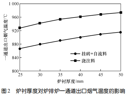 炉衬厚度对一通道出口烟气温度的影响两种水冷壁炉衬的厚度对一通道出口烟气温度的影响如图 2所示。可以看出:两种炉衬厚度在 25~50 mm 变化时,一通道出口烟温均高于 850 ℃;两种水冷壁内衬结构均呈现炉衬越厚一通道出口烟温越高的趋势;当两种炉衬厚度相同时,浇注料炉衬的一通道出口烟温明显高于挂砖 自流料炉衬的一通道出口烟温。