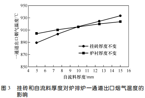 2、对于挂砖 自流料炉衬,挂砖厚度不变时,自流料厚度越大,一通道出口烟气温度越高;炉衬总厚度不变时,挂砖越厚、自流料层越薄,一通道出口烟气温度越低;炉衬各工作层厚度固定时,一通道出口烟气温度随自流料热导率的升高而降低,通过调整自流料热导率,一通道出口烟温差值可达 70 ℃。