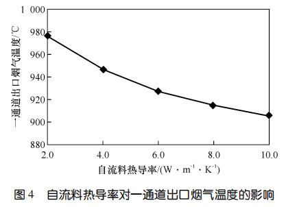 sic 自流料热导率对一通道出口烟气温度的影响图4示出了自流料热导率对一通道出口烟气温度的影响。可以看出,炉衬各工作层厚度固定时,一通道出口烟气温度随自流料热导率的升高而降低。通过调整自流料热导率,一通道出口烟气温度差值高达 70 ℃。