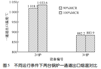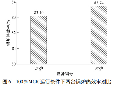 两台设备运行 11 个月后进行了能效测试。图5对比了 90%锅炉大的连续蒸发量(简称 mcr)和100%mcr 条件下锅炉一通道的出口烟温。图6示出了100%mcr运行条件下两台锅炉热效率的对比。结果显示:在 90%mcr 运行条件下,3#炉一通道出口烟温比2#炉低 135.9 ℃,在100%mcr 运行条件下,3#炉一通道出口烟温比 2#炉低 149.7 ℃,3#炉的热效率比 2#炉高 0.64%。相较而言,使用膜式壁炉衬的3#炉在负荷相当的情况下,余热锅炉热效率更高。